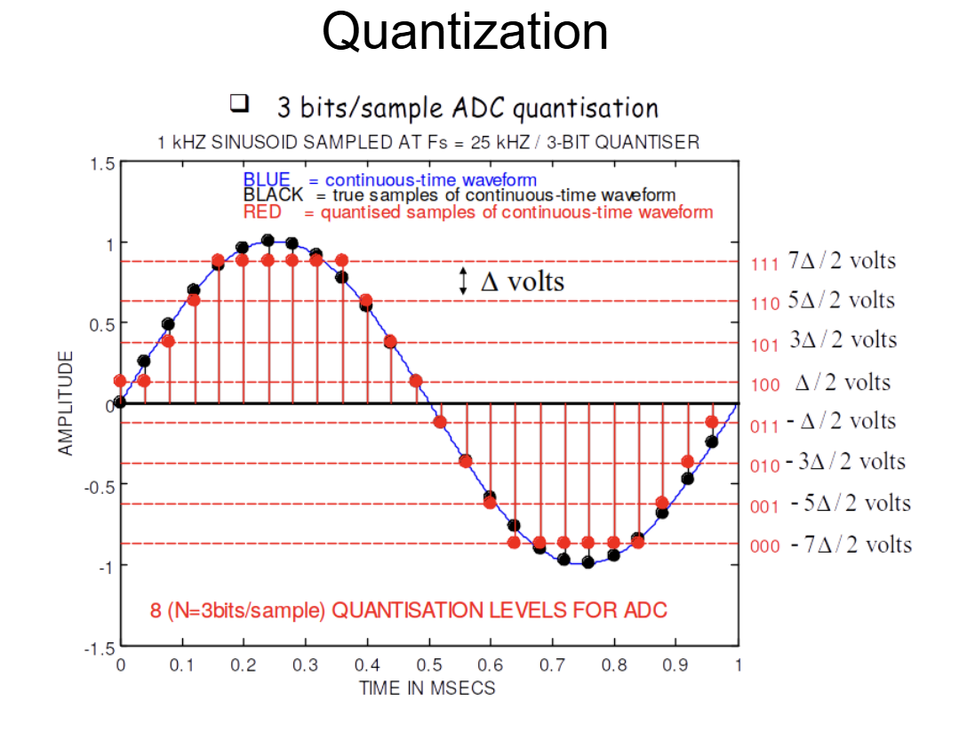 A sinusoidal signal x(t)=Asin(2πft) with amplitude A=1 is uniformly quantized using a 3-bit quantizer. Assume the signal is full-scale.