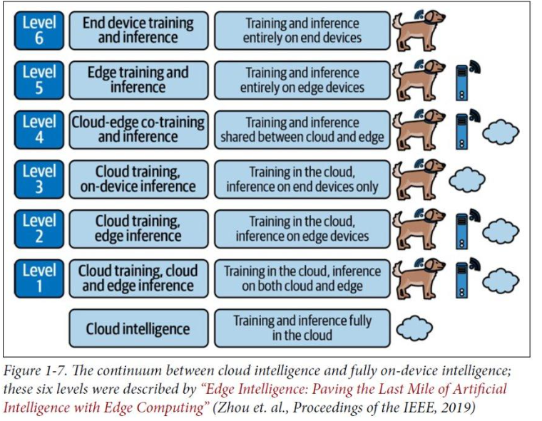 Figure shows the continuum from cloud AI to fully on-device intelligence. As we’ll see later, edge AI can be spread across entire distributed computing architectures—including some nodes at the very edge, and others in local gateways or the cloud.