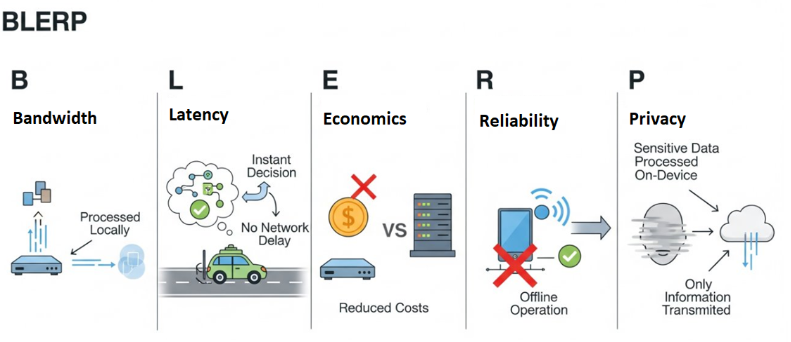 Jeff Bier, founder of the Edge AI and Vision Alliance, created this excellent tool for expressing the benefits of edge AI. The primary goal of Edge AI is often not to achieve perfect performance but to be good enough to provide significant value. The benefits of local processing (BLERP) often outweigh a slight reduction in accuracy. Let’s discuss these one by one.