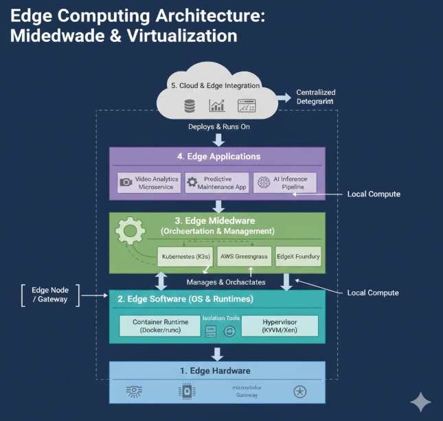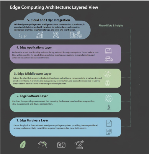 The below 5-layer architecture provides a deeper view of how edge systems are built internally, breaking the edge stack into hardware, software, middleware, applications, and cloud-integration layers. Both edge end nodes and edge gateways contain the same foundational layers of edge architecture, but end nodes implement lightweight, constrained versions while gateways provide a richer, more capable implementation designed for multi-device aggregation and advanced local intelligence.
