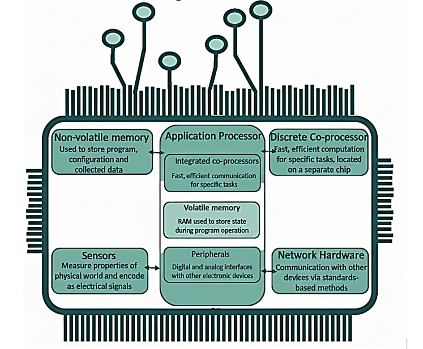Fig: Edge Computing Hardware: A Component-Level View The diagram illustrates the core components typically found within an edge device or edge node, which are crucial for performing computation and processing data close to the source, rather than sending everything to a centralized cloud. This proximity is the essence of edge computing, enabling low-latency and real-time applications. The importance of this architecture lies in how these components work together to process and manage data locally: Sensors: These are the data generators. They measure properties of the physical world (e.g., temperature, pressure, images) and encode them as electrical signals. They are the starting point of the edge computing process. Non-volatile memory: This memory (like flash or SSD) is used to store the program, configuration, and collected data persistently, even when the power is off. It's where the operating system and application software reside. Application Processor: This is the device's central brain. It handles general-purpose tasks and often includes integrated co-processors for fast, efficient communication and specific tasks (like digital signal processing). Volatile memory (RAM): Used to store state during program operation. It's fast, temporary storage necessary for the processor to execute tasks efficiently. Discrete Co-processor: This is a separate, specialized chip used for fast, efficient computation for specific, demanding tasks, such as machine learning inference or complex encryption. Its separation allows the application processor to focus on general-purpose tasks. Peripherals: These are the interface components that manage digital and analog interfaces for connecting with other electronic devices (e.g., display drivers, I/O controllers). Network Hardware: This enables communication with other devices (including other edge nodes, the cloud, or central servers) via standards-based methods (like Wi-Fi, Ethernet, 5G). This is how data and processed insights are moved around the network.