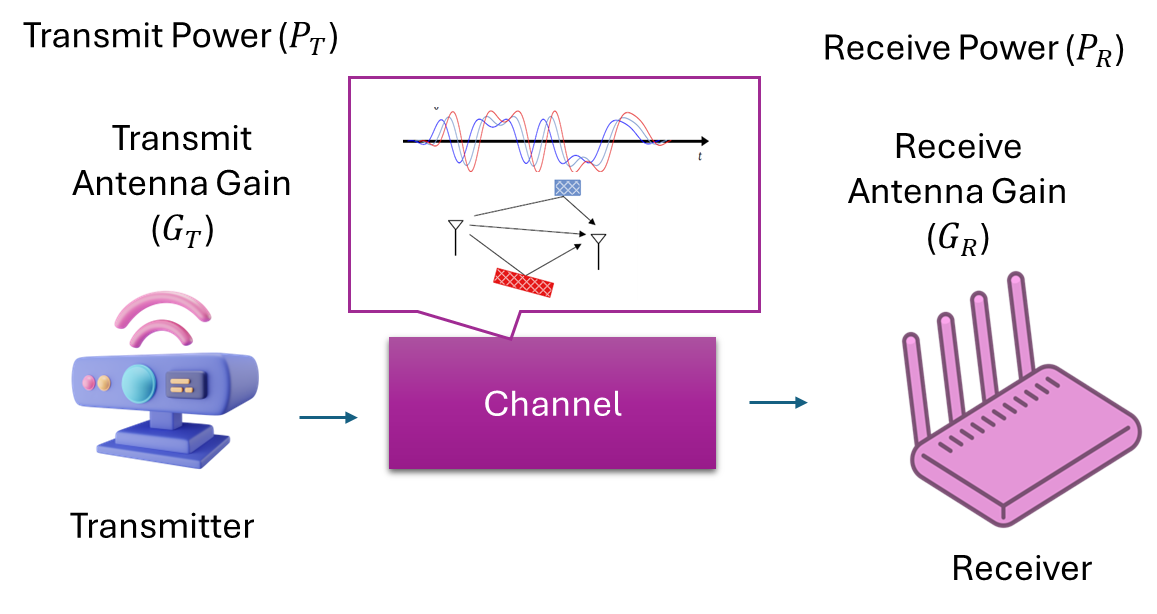 - The amount of power received at the receiver also depends on the gains introduced by transmit and receive antennas. For directional antennas such gain terms are function of relative alignment of antennas. However, assuming omni-directional transmission these gains are often denoted by GT and GR.