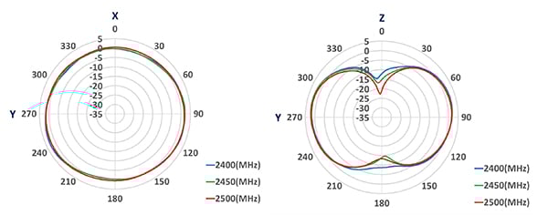 Radiation patterns graphically represent how the antenna radiates or absorbs radio energy in 3D space. Datasheets typically show the maximum extent in the XY and YZ planes when the antenna is mounted as intended. (Image source: Amphenol).